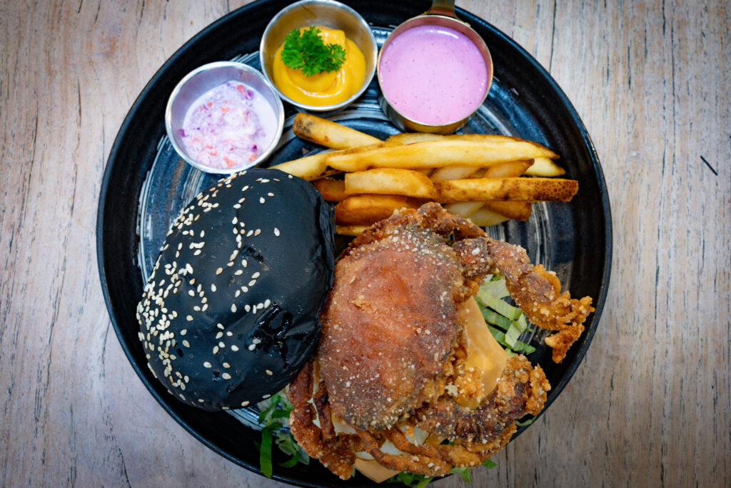 予定通り、「Crunchy Crabby Creation」を注文(36リンギット)。これはソフトシェルクラブを真っ黒なバンズで挟んで食べるバーガーで、かつ、中身にかけるソースが淡い紫色のクリーム状のもの。写真を撮らずしてはいられない要素が満載の一品。何年か振り(何十年か振り)でソフトシェルクラブを食べましたが、これだけでも満足感十分。