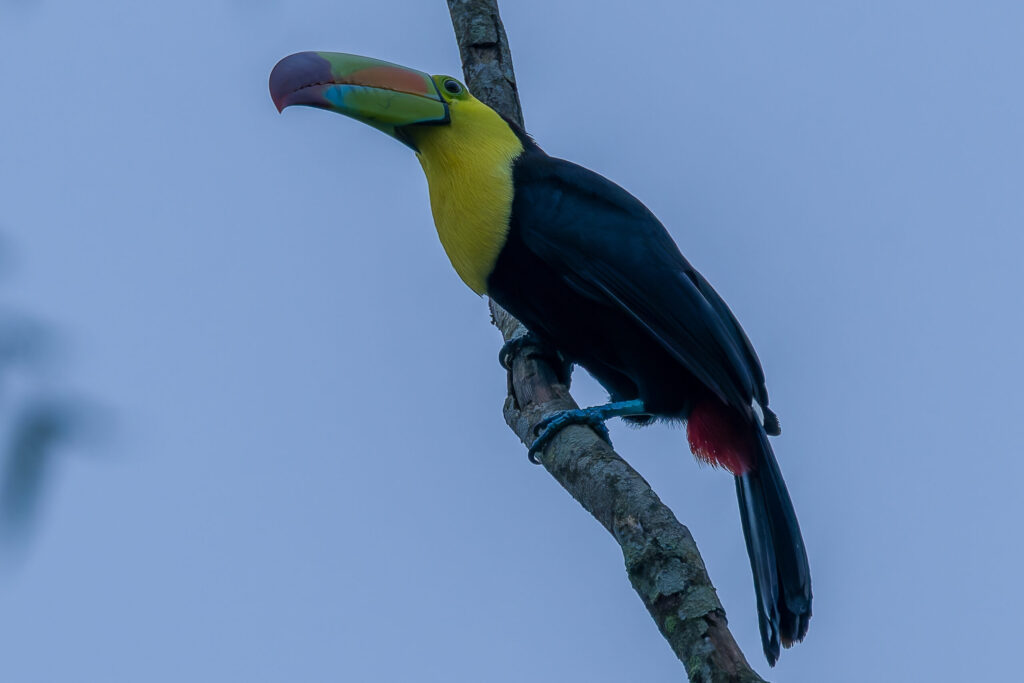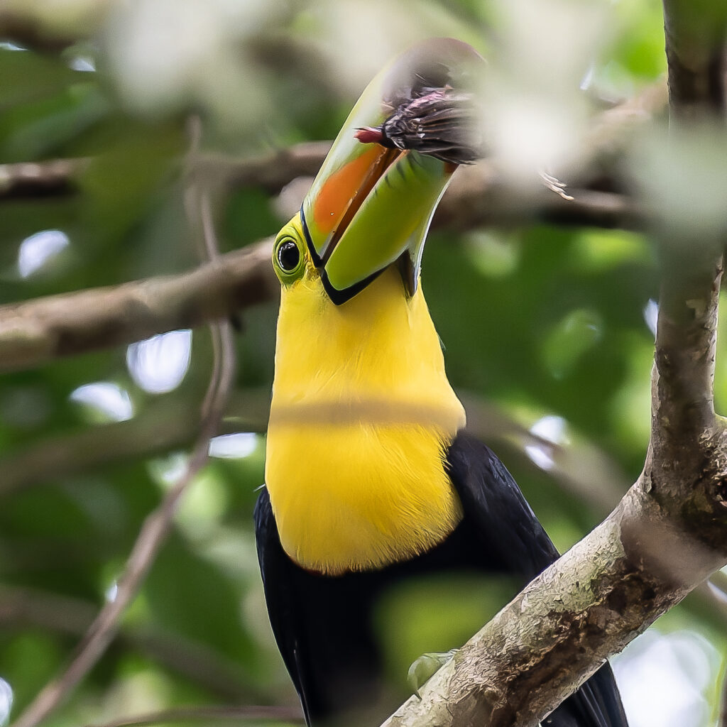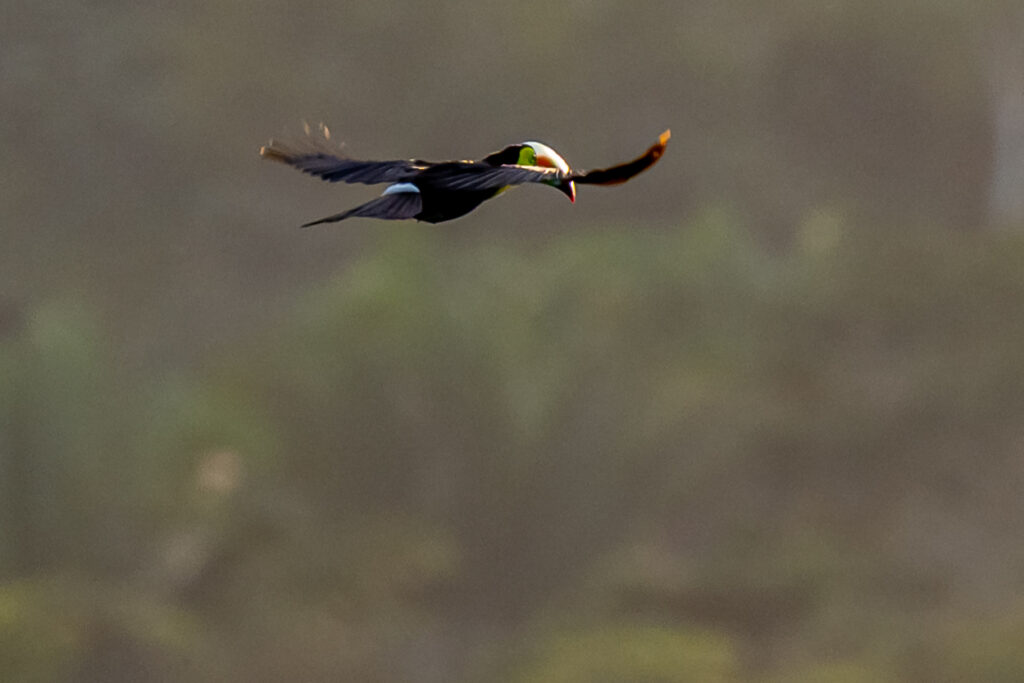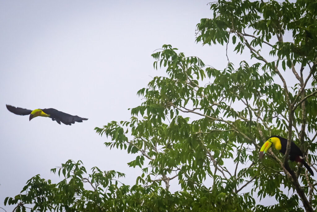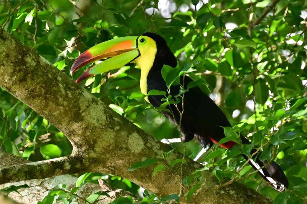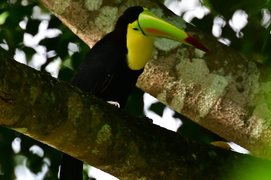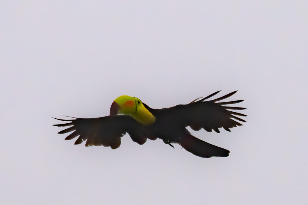 これ以来、やはりカヨ郡内で何度かトゥカンに出会うことが出来た。大きなクチバシに小さな果物を挟んで美味しそうに食べていた。ただ完全な草食ではなく、あのクチバシでどうやって食べるのかわからないが、他の鳥の卵や、そして時折トカゲも捕食するとのこと。飛んでいる姿を見かけることもあった。クチバシが身体の半分近いサイズのためかなりバランスが悪そうに思えるが、意外に(いや、鳥だから当たり前だが)飛ぶスピードは速い。また、人の気配を察すると、さっと飛び立ってしまう。見かけの割には、結構機敏である。