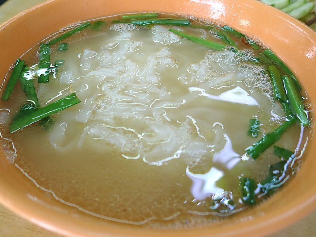 ということで、ホテルでのチェックインも早々に、これらの店に向かった。途中、点心の店がいくつかあり誘惑に負けて入りそうになるが、既に午後2時近いことからどの店もランチの後片付けタイムになっており閉店中。一抹の不安に襲われつつOng Keeに辿り付くと、無事営業中であった。早速、チキンライス、もやし、そしてこれもイポー名物らしい平打ちの米粉麺を注文。腹が空いていたこともあり、イポーならではの味をかみしめつつも、二人でがっつき、あっという間に食べ終わる。飲み物の中国茶代も含め、33.9リンギット(一人当たりにすれば17リンギット)。味、量とも十分満足(平打ち麺が、意外にも量がある)。