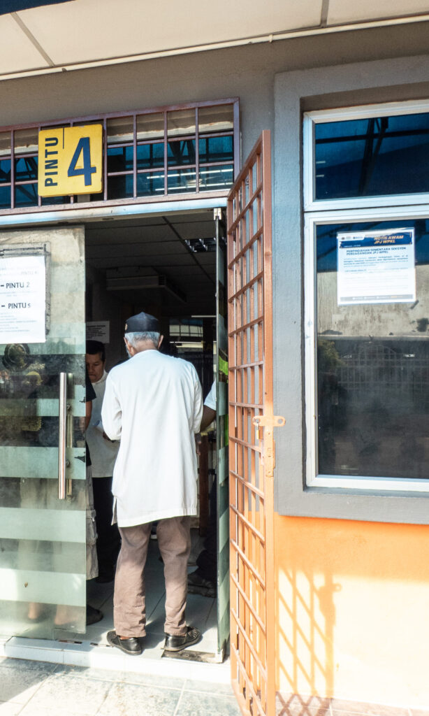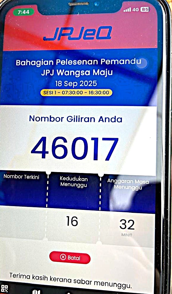 「到着が遅れて出直しになることは絶対に避けよう」とJPJ開所時間の午前8時よりも前に、申請時と同じ4番入り口に着くと、すでにそこには20人ほどの列。しばらく並んでいると、おじさんが現れ、入り口前に置かれたサインボードに大きく表示されたQRコードを指刺し「JPJeQのアプリでこれをスキャンするように」との指示。ここで初めて、JPJeQのアプリがなぜ必要なのかを理解。そして、QRコードをスキャンすると、そこには受付番号と対応カウンターの番号が表示される仕組みです。申請時は窓口で紙をもらっていましたが、免許証受領の時はQRコードで番号が表示される仕組みのようです。