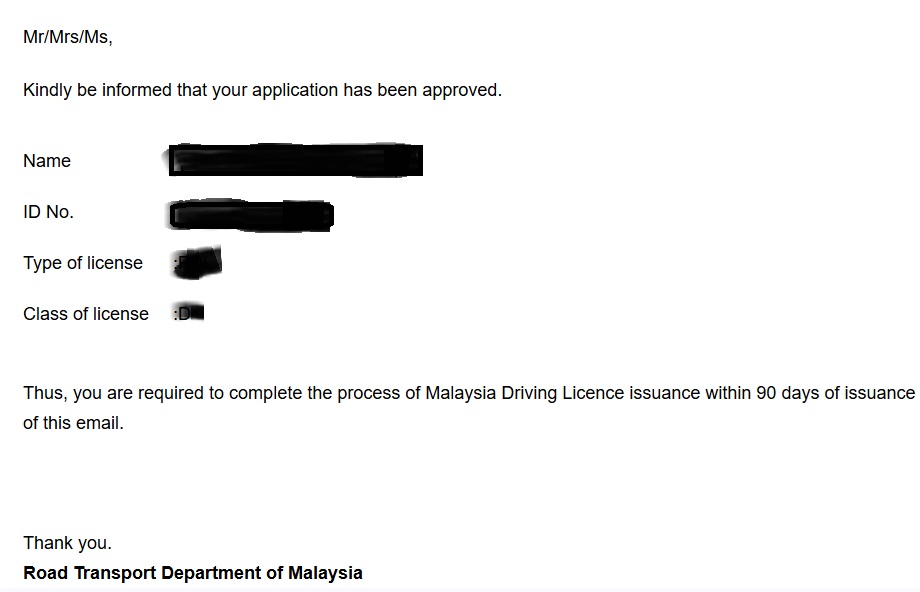 申請受理の後は、連絡連絡を待つのみ。同じように運転免許切り替えをした方のウエブサイトをみると、実際には3ヶ月以上かかったというケースもあるようなので、「さすがに1ヶ月では無理かな~」と思っていたところ、なんと申請日(2回目のJPJ出頭)からちょうど1ヶ月目にメールで承認連絡が来ました。