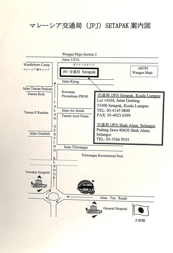 日本大使館でJPJの場所を記載した紙をもらえます(右参照)。クアラルンプールにあるJPJ(住所:Lot 14264, Jalan Genting Kelang, Setapak, 53300 Kuala Lumpur)とセランゴールにあるJPJ(住所:Padang Jawa, 40620 Shah Alam, Selangor)のいずれかで申請・取得が可能です。JPJ自体はマレーシア各地にあり、クアラルンプールの以外のJPJでも免許証取得は可能なようです(例えばペナンのJPJ)。ただし、例えば、ランカウイのJPJでは切り替え作業の対応はしていないようです。よって、事前に要確認。私の場合はマレーシアに来て最初の1か月はクアラルンプールに滞在していたため、迷うことなくクアラルンプールのJPJで申請しました。日本大使館でもらえるクアラルンプールのJPJについては、上記の紙に地図も記載されています。
