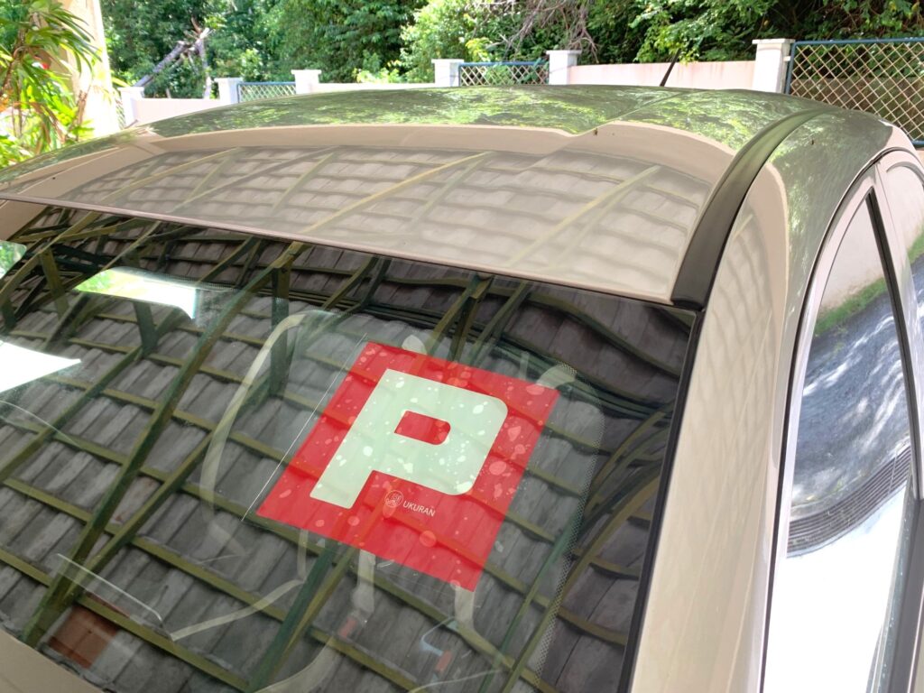 エ)その他:(免許証受領後に)Pマーク初心者マークステッカーの購入。日本では何年も運転歴があってもマレーシアで最初の運転免許取得であれば、Pマークを車の前部、後部の窓ガラスに貼ることが必要です。