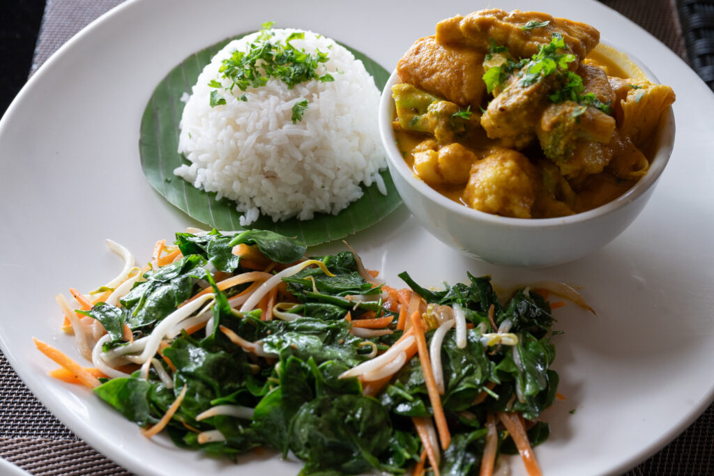 マレーシア料理のベジタリアンバージョンを楽しめるレストランThe Fat Frog Langkawi。ランカウイのクアタウンと空港の中間地点ぐらいに位置する高台にあり、きれいに整備されたアップダウンのある緑地(ゴルフコース?)が目の前に広がり、食事をしながら気持ちの良い開放感も味わえます。