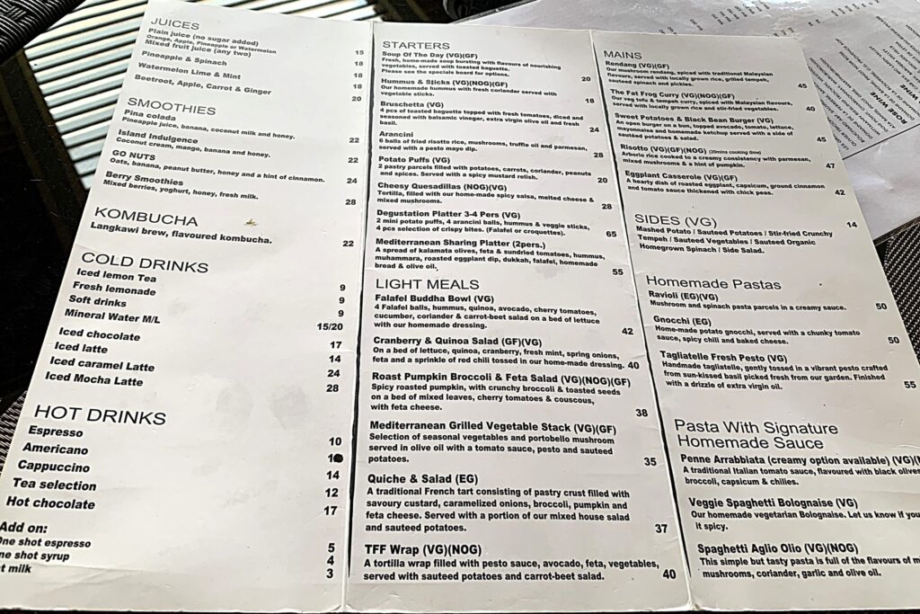 いつもは街中の屋台かエコノミーライス、もしくはナイトマーケットで「安い、美味い」を堪能している自分たちですが、たまの贅沢で、The Fat Frog Langkawi へ。ベジタリアンレストランであり、ヴィーガンに対応したメニューも(メニューに「VG」と書かれています。その他グルテンフリー「GF」のものも)。