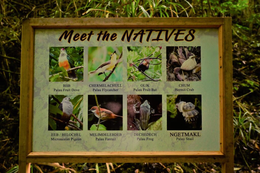この日はまだ朝が早かったためか、自分以外には歩いている人はいない。斜面の登り降りで荒くなった自分の息使い以外は聞こえない静けさの中に、パラオの国鳥であるPalau Fruit doveのホーホーという鳴き声を始め、複数の鳥の鳴き声が響き渡る。あたりを見回すも鳥たちは1羽しか視認できなかったけれど、バードウォッチングしている気分に。トレイルの途中に立てられた案内板によると、パラオのネイティブの鳥8種類がいるらしい。ガサガサッという音が急に聞こえて、慌ててその方向をみると陸カニが慌てて隠れようとする。