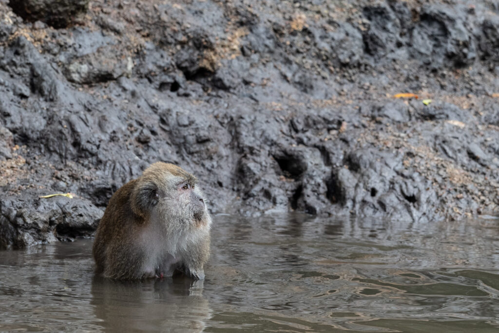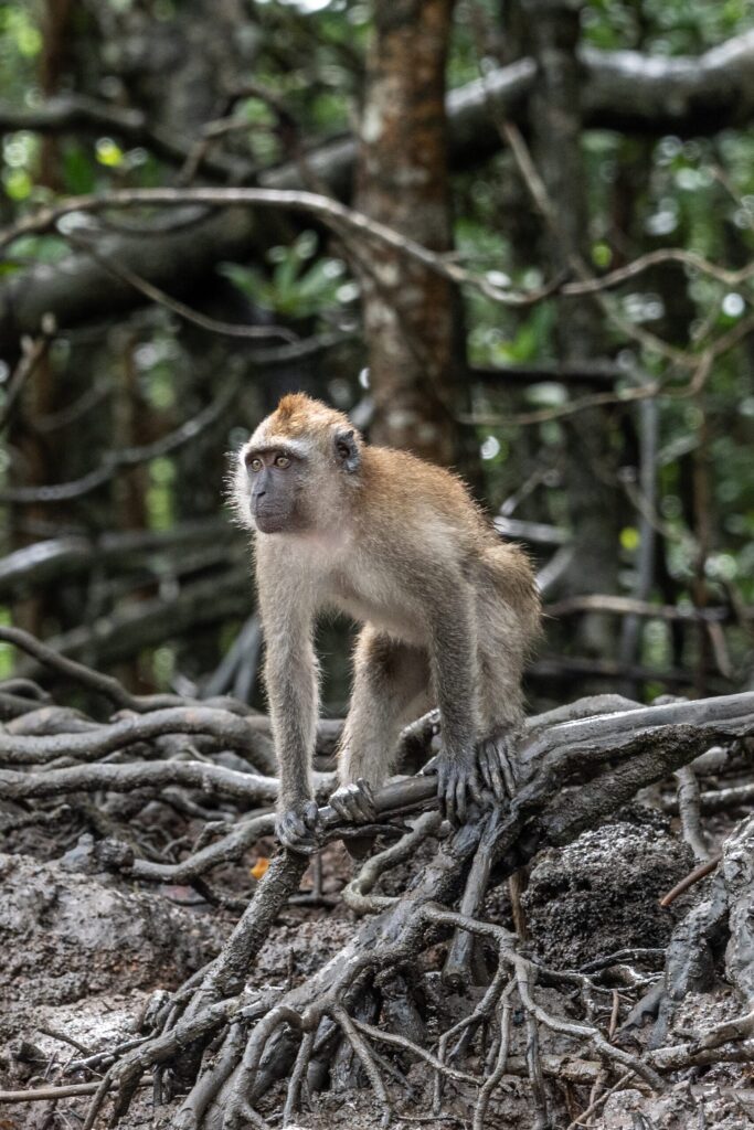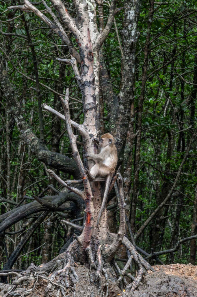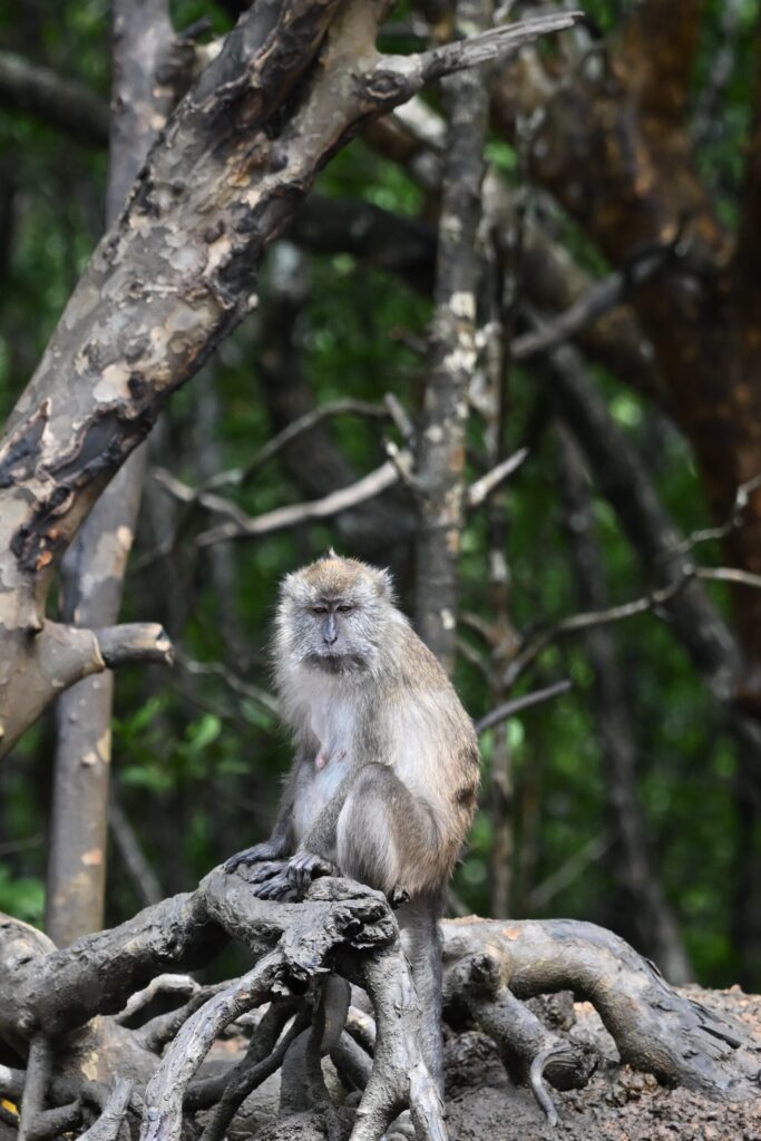 また、タイミングによってはダスキーリーフモンキーを見ることもあります。こちらはカニクイザルほどは人間に慣れていないのか、マングローブの木の上からじっとボートの方を眺めていたりします。